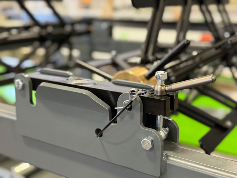 Adjusted via wheel handle with quick handle locking for position. The width adjustment positions via steel imbedded belt with 5 year warranty.