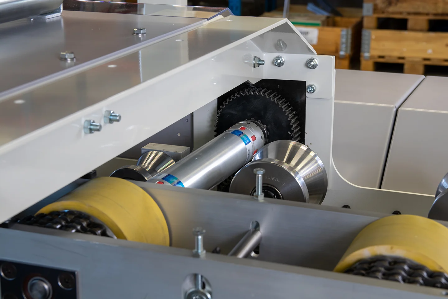 ONROLL has a truly symmetrical width adjustment on both sides of the drive rollers, making infeed easy and quick. Precision linear rails with a high-pitch lead screw ensure parallel positioning of the tooling based on the width of the panel, with no off-center side loading. The tooling is free-rolling; the center neoprene rollers drive the material through ONROLL to minimize torsion in the panel.