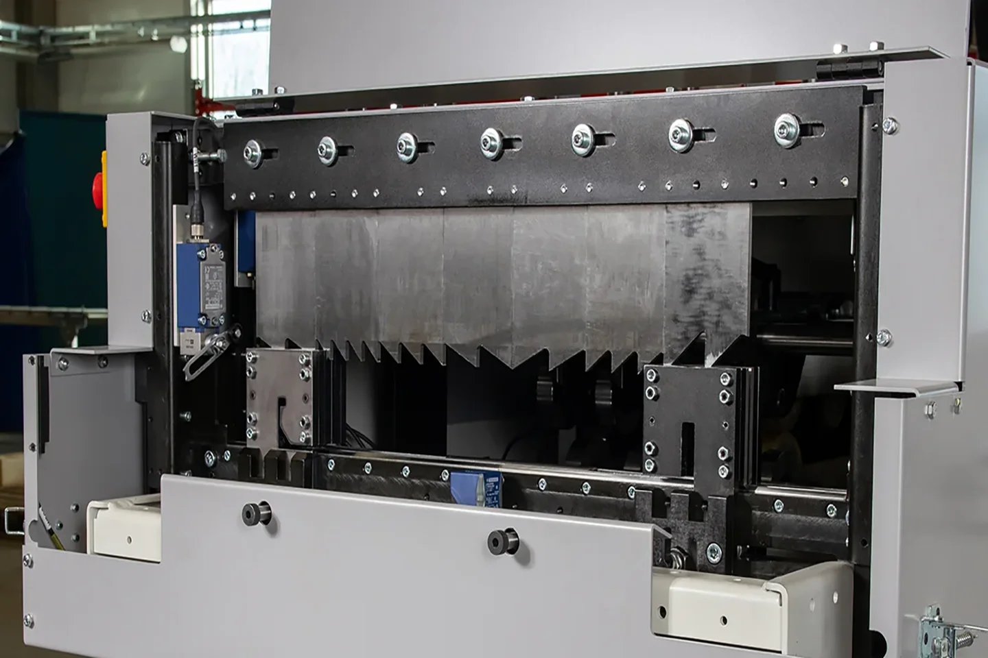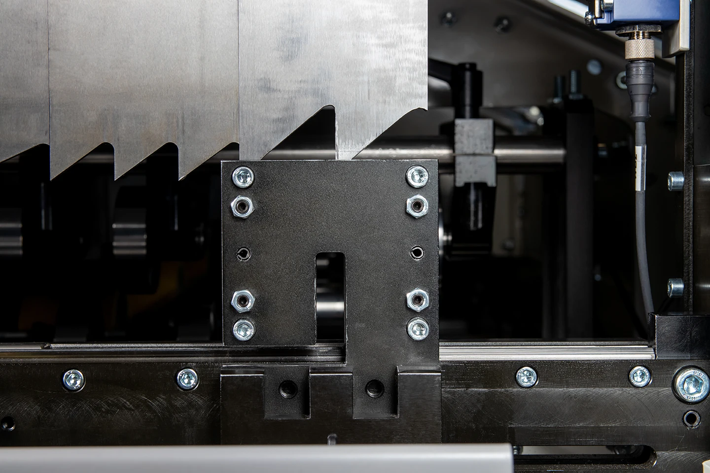 Easy view of tooling through hinged locking windows. No need to remove covers to view infeed of panel.